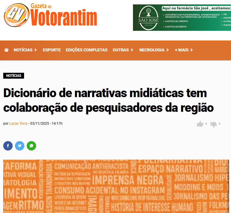 Na Mídia Dicionário de narrativas midiáticas tem colaboração de pesquisadores da região 3 de novembro de 2025 assecom Alunos e professores do Programa de Pós-Graduação em Comunicação e Cultura da Uniso são citados na matéria Gazeta de Votorantim – 03/11/2025: