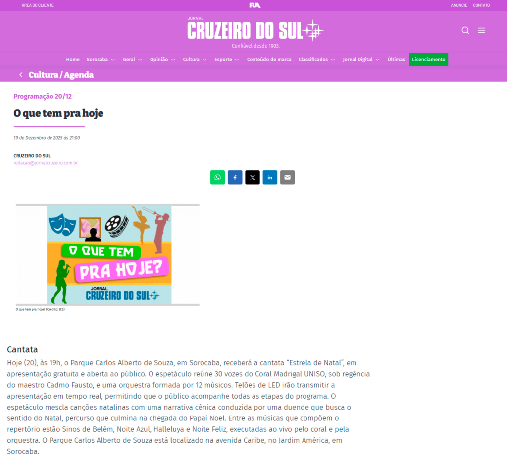 Na Mídia O que tem pra hoje 20 de dezembro de 2025 assecom Cantata de Natal do Coral Madrigal Uniso é citada em agenda cultural Jornal Cruzeiro do Sul – 20/12/2025