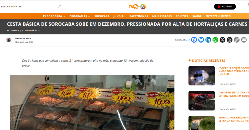 Na Mídia Cesta básica de Sorocaba sobe em dezembro, pressionada por alta de hortaliças e carnes 13 de janeiro de 2026 assecom Pesquisa da Uniso serviu de base para a matéria TV Sorocaba 13/01/2026: