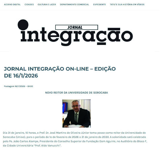 Na Mídia Novo Reitor da Universidade de Sorocaba 16 de janeiro de 2026 assecom Cerimônia de posse é citada em nota Jornal Integração (Tatuí) – 16/01/2026:
