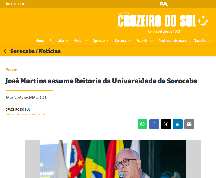 Na Mídia José Martins assume Reitoria da Universidade de Sorocaba 30 de janeiro de 2026 assecom Jornal Cruzeiro do Sul – 30/01/2026: