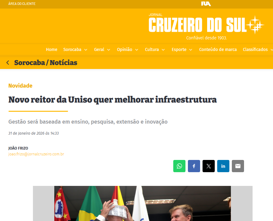 Na Mídia Novo reitor da Uniso quer melhorar infraestrutura 31 de janeiro de 2026 assecom Jornal Cruzeiro do Sul – 31/01/2026