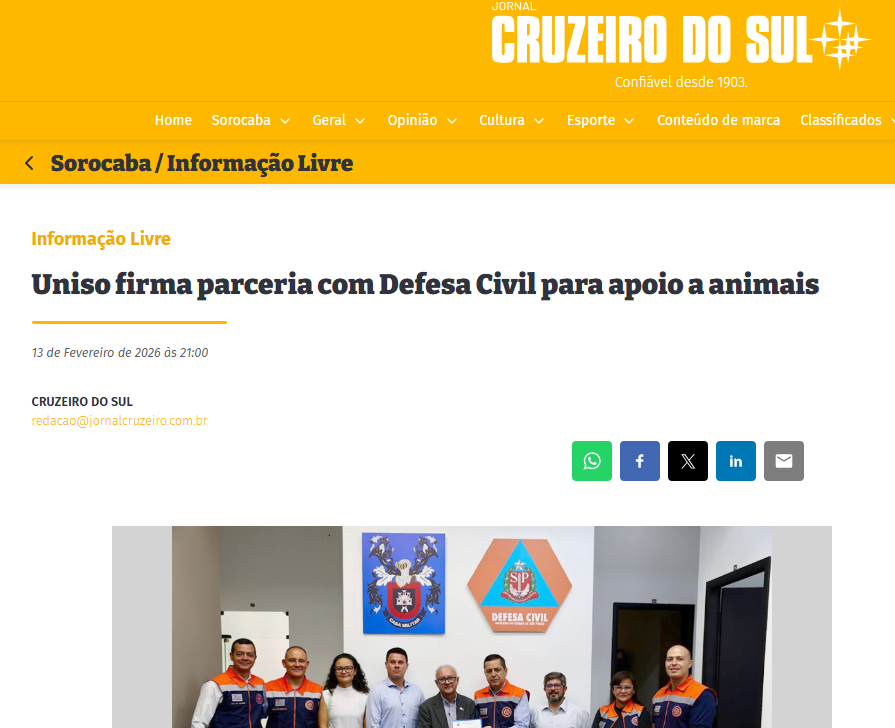 Na Mídia Uniso firma parceria com Defesa Civil para apoio a animais 13 de fevereiro de 2026 assecom O acordo prevê apoio técnico a animais domésticos e silvestres vítimas de desastres em todo o Estado Jornal Cruzeiro do Sul – 13/02/2026
