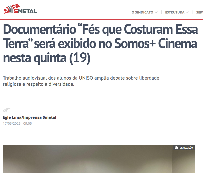 Na Mídia Documentário “Fés que Costuram Essa Terra” será exibido no Somos+ Cinema nesta quinta (19) 17 de março de 2026 assecom Documentário de alunos de Jornalismo da Uniso é exibido no Smetal Smetal 17/03/2026: